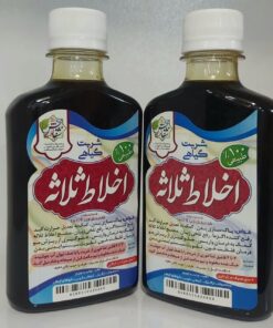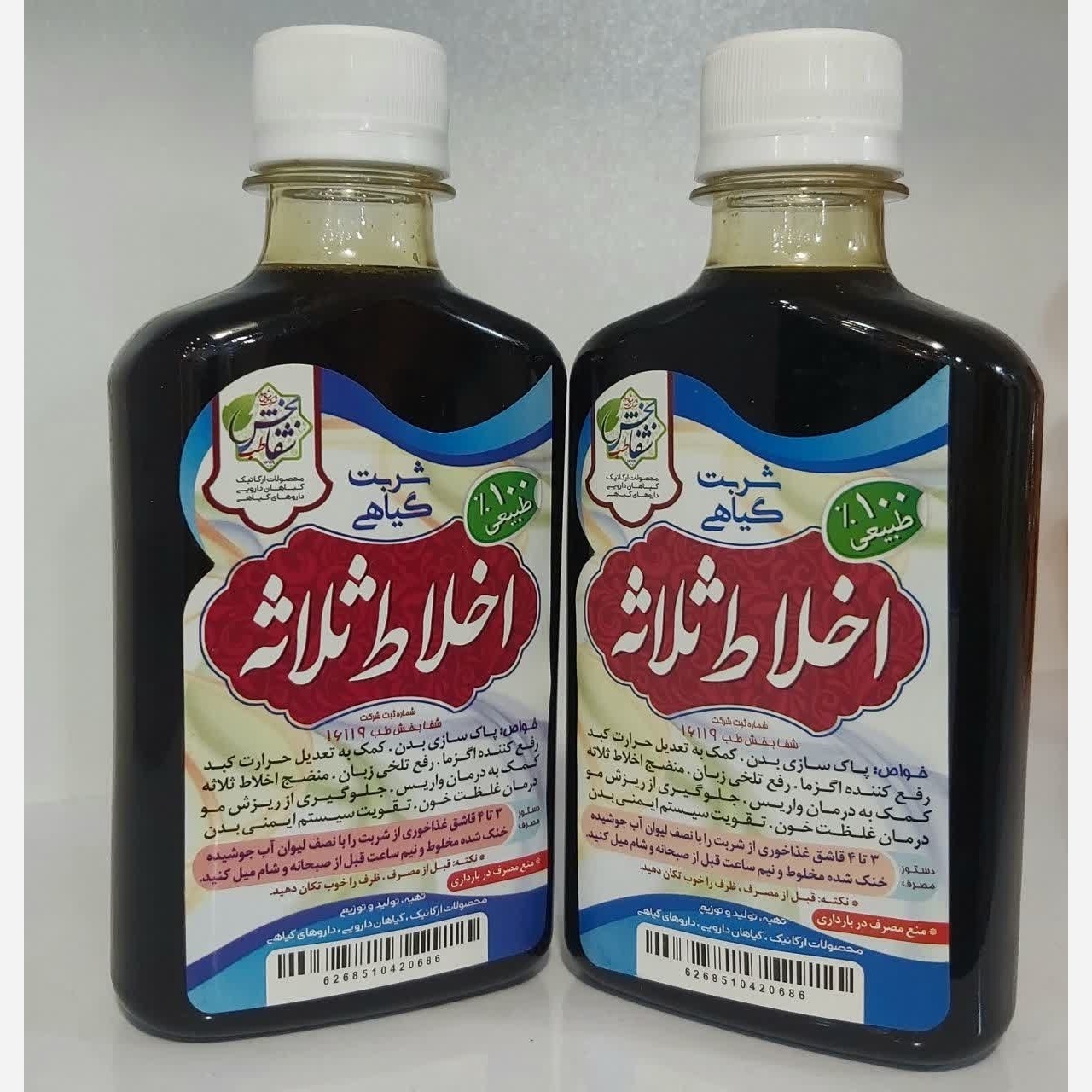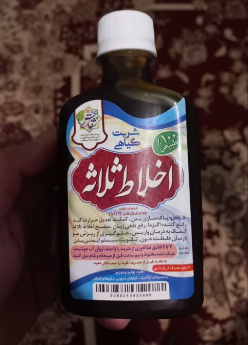 شربت اخلاط ثلاثه (شربت منضج مصفای خون) ترکیبی است از عناب، پرسیاوشان، بادرنجبویه، گل نیلوفر، خراما، تخم کاهو، شاهتره، گل سرخ، بابونه، زوفا،لسان الثور، آویشن، عنب الثعلب و… که از جمله داروهای فوق العاده قوی در رابطه با نضج (جذب و دفع) اخلاط غیرطبیعی و همچنین پاکسازی از اخلاط سوخته می باشد.
